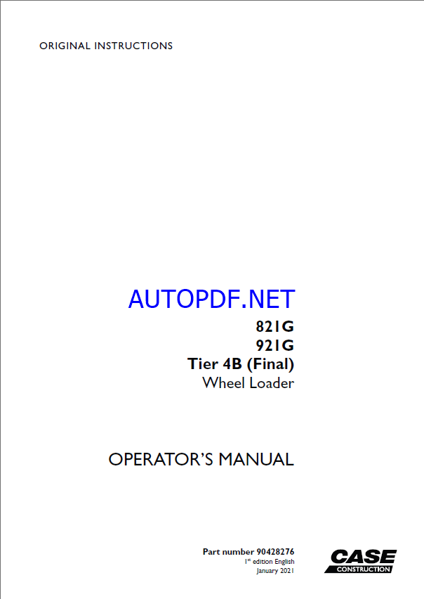 Case 821G, 921G Tier 4B Final Wheel Loader Operators Manual (90428276) (January 2021)