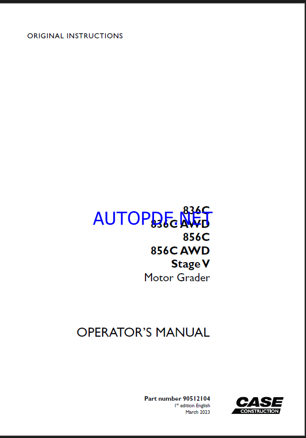 Case 836C, 836CAWD, 856C, 856CAWD Stage V Motor Grader Operators Manual (90512104) (March 2023)