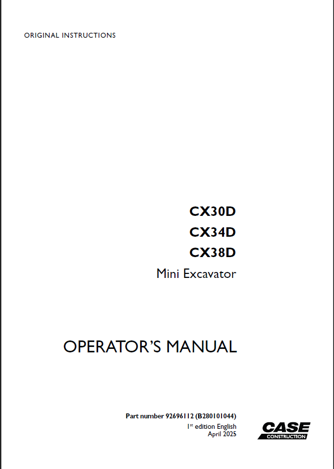 Case CX30D, CX34D, CX38D Mini Excavator Operators Manual (B280101044) (April 2025)