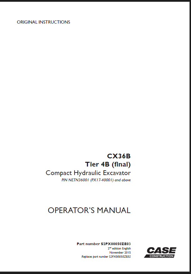 Case CX36B Tier 4B Final Compact Hydraulic Excavator Operators Manual (S2PX00050ZE03) (November 2015)