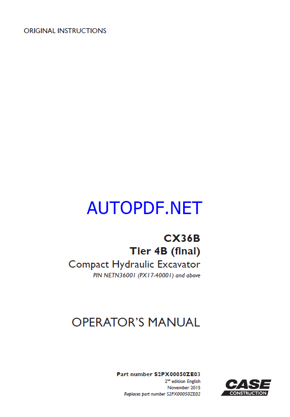 Case CX36B Tier 4B Final Compact Hydraulic Excavator Operators Manual (S2PX00050ZE03) (November 2015)
