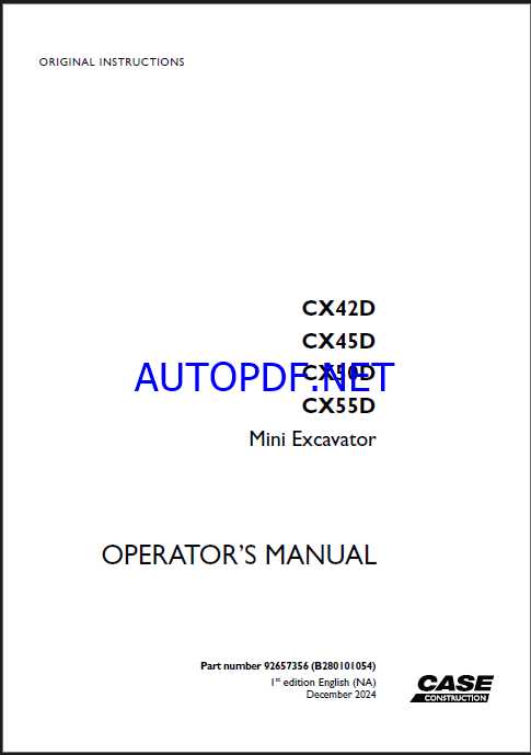 Case CX42D, CX45D, CX50D, CX55D Mini Excavator Operators Manual (92657356) (December 2024)