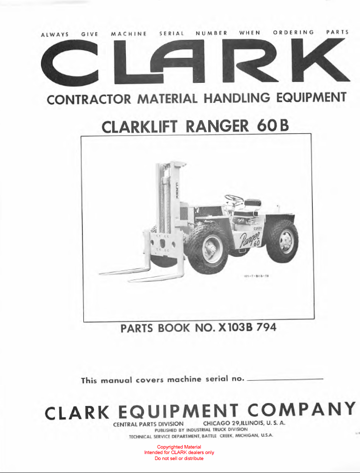 Clark Clarklift Ranger 60B Forklift Parts Manual (X103B)