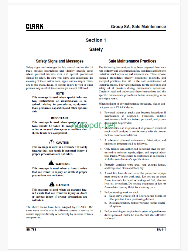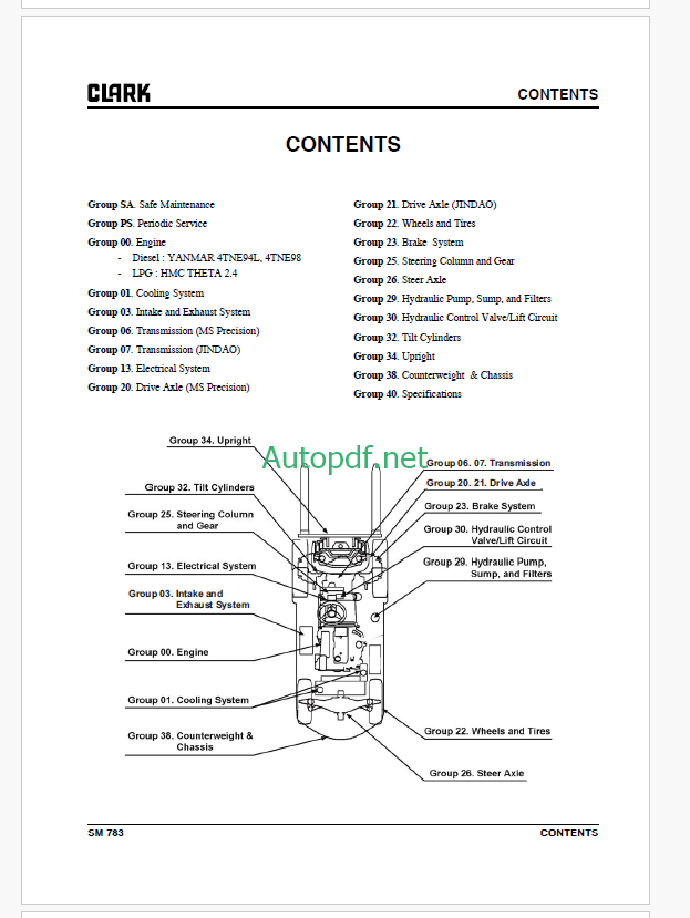 Clark GTS20d, GTS25d, GTS30d, GTS33d, GTS20L, GTS25L, GTS30L, GTS33L Engine Forklift Service Manual (SM783)