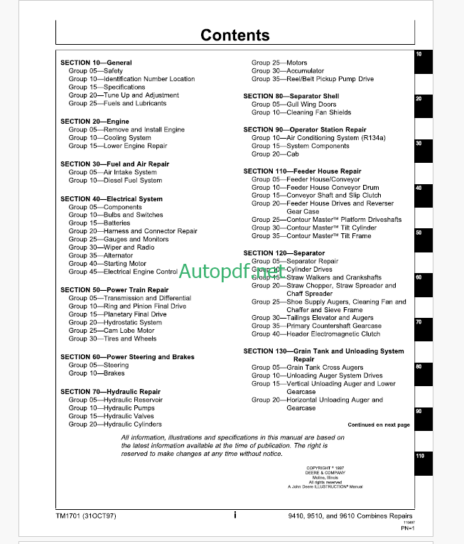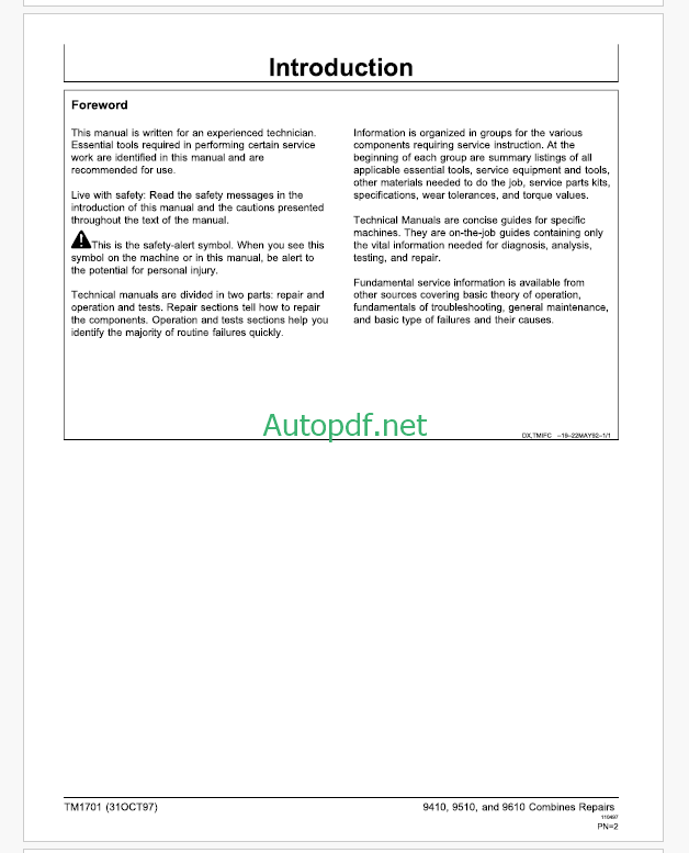 John Deere 9400 9500 SideHill 9500 and 9600 MAXIMIZER Combines Diagnostics and Repair Technical Manual (TM1402S)