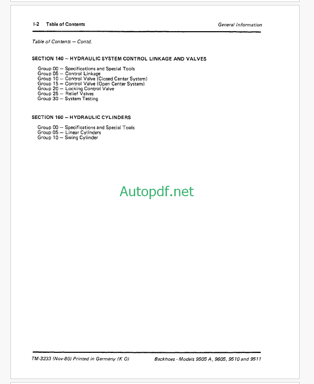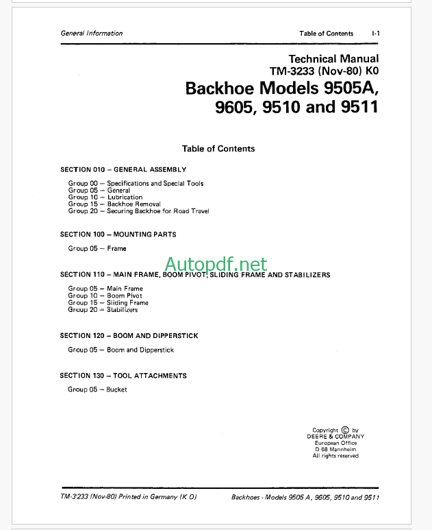 Model: 9505A, 9605 9510A and 9511 Backhoe