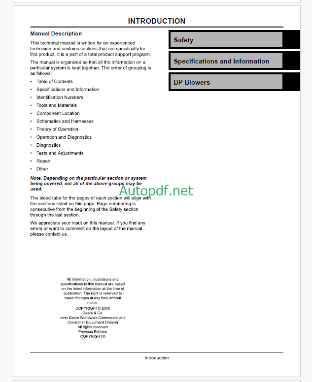 John Deere BP45LE and BP65LE Backpack Blowers Technical Manual (TM104119)