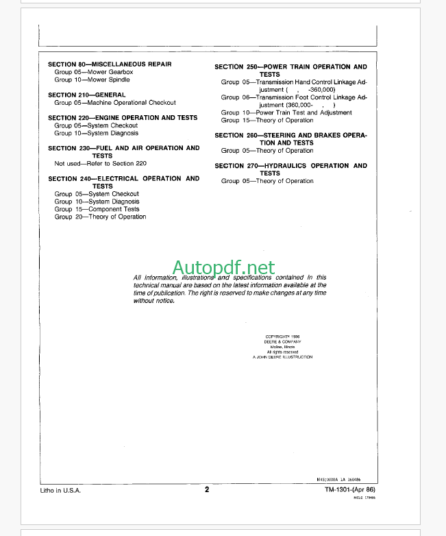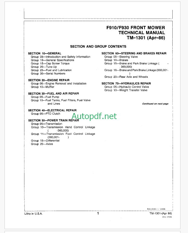 John Deere F910 F930 Front Mower Technical Manual (TM1301)
