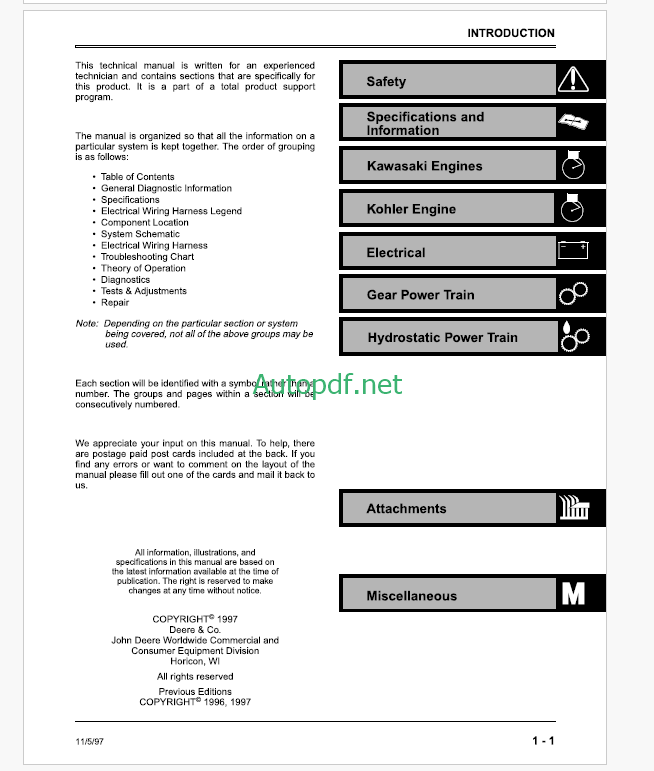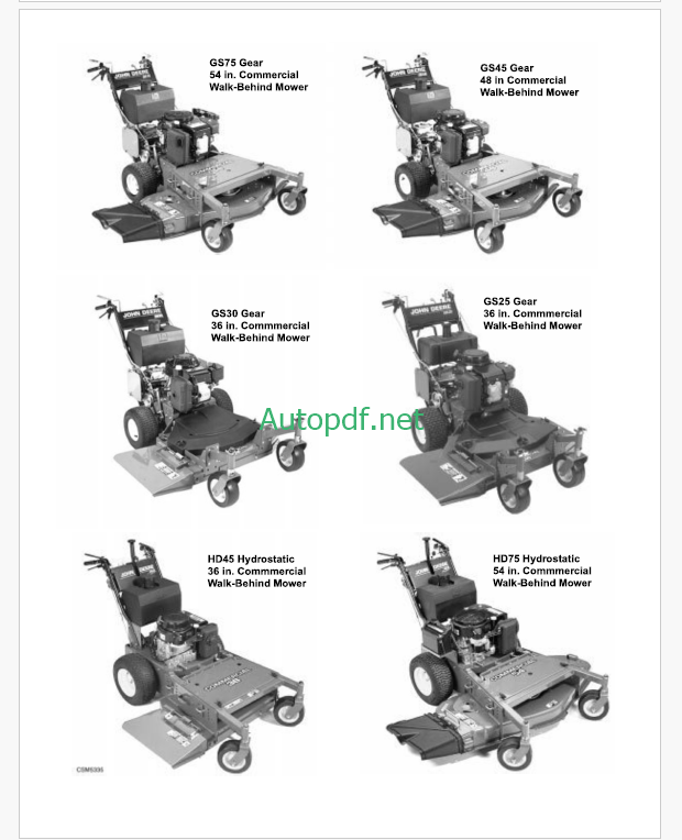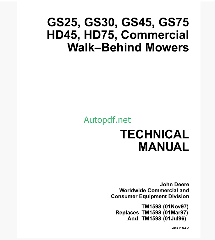 John Deere GS25 GS30 GS45 GS75 HD45 HD75 Commercial Walk—Behind Mowers Technical Manual (TM1598)