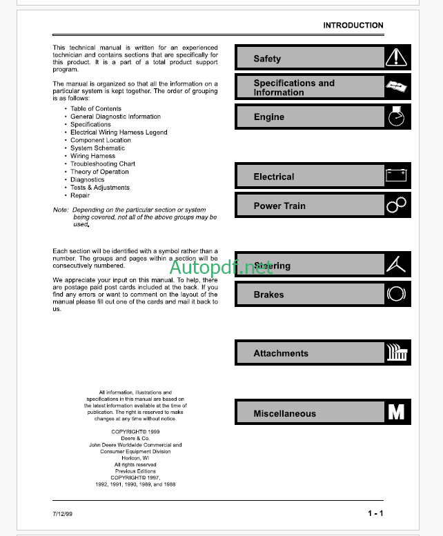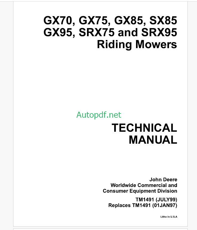 John Deere GX70 GX75 GX85 SX85 GX95 SRX75 and SRX95 Riding Mowers Technical Manual (TM1491)