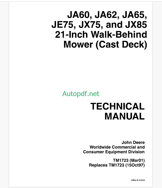 John Deere JA60 JA62 JA65 JE75 JX75 and JX85 21-inch Walk-Behind Mower (Cast Deck) Technical Manual (TM1723)