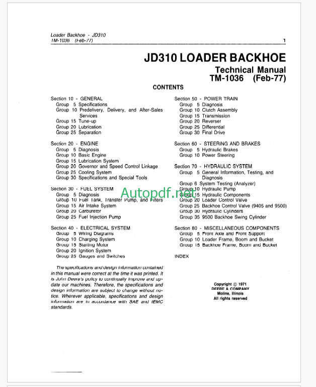 John Deere JD310 Loader Backhoe Loader Technical Manual (TM1036)