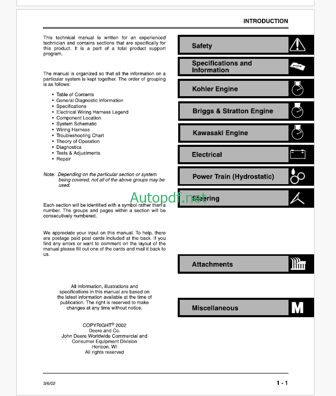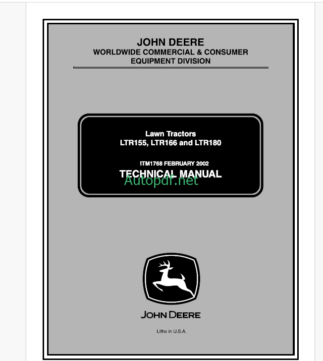 John Deere LTR155 LTR166 and LTR180 Lawn Tractors Technical Manual (TM1768)