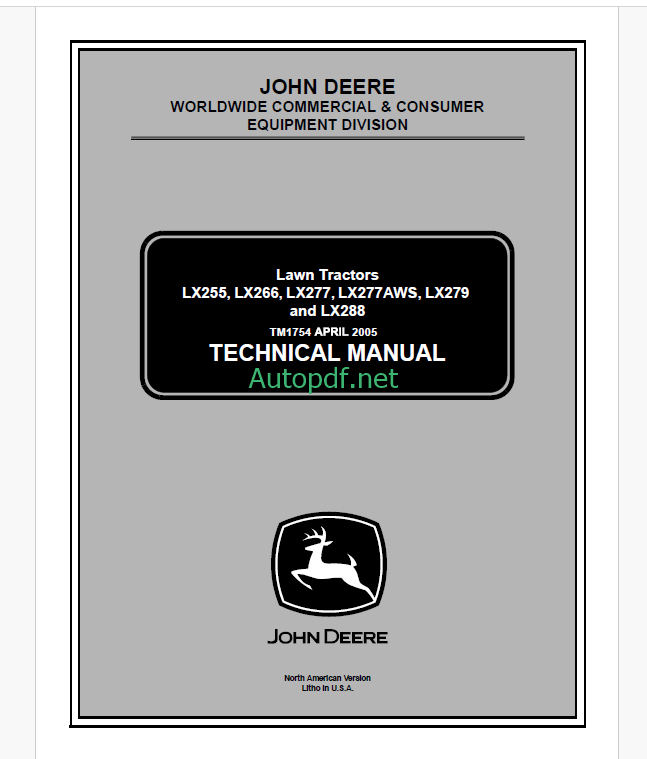 John Deere LX255 LX266 LX277 LX277AWS LX279 and LX288 Lawn Tractors Technical Manual (TM1754)