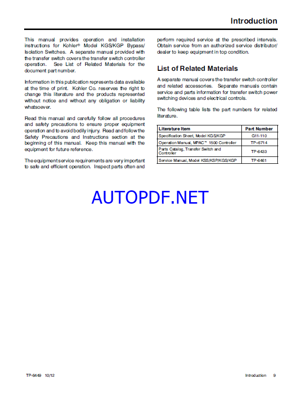 Kohler KGS, KGP Automatic Transfer and Bypass, Isolation Switches Installation Manual (tp6449)
