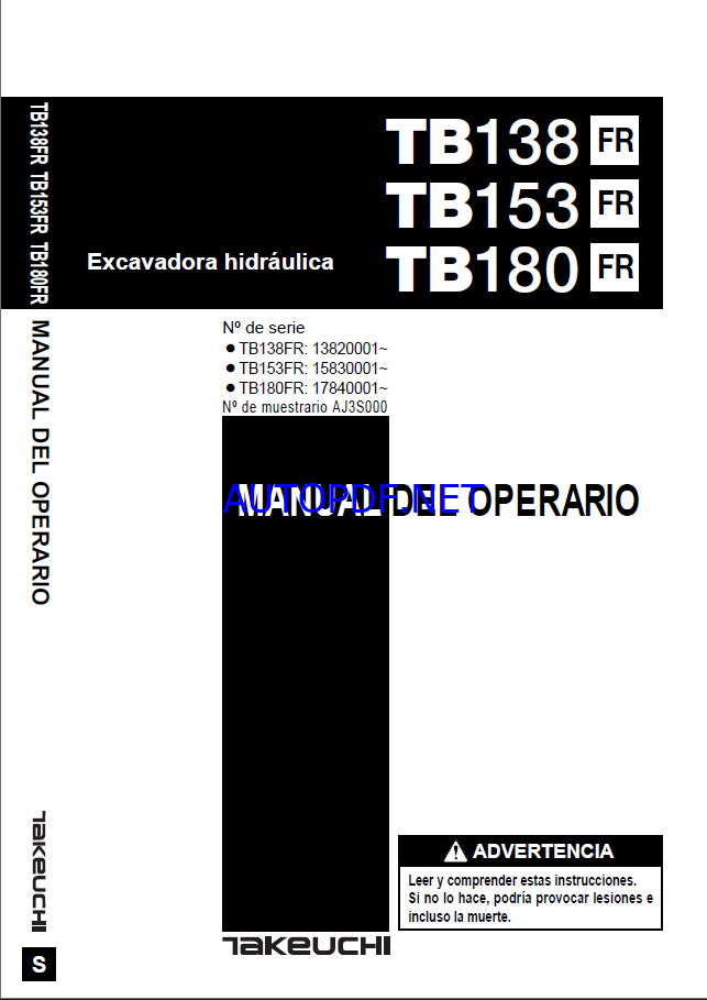Takeuchi OPERATORS MANUAL TB138FR-153-180 AJ3S000 (SPANISH)