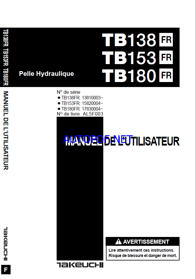 Takeuchi OPERATORS MANUAL TB138FR-153-180 AL5F003 (FRENCH)