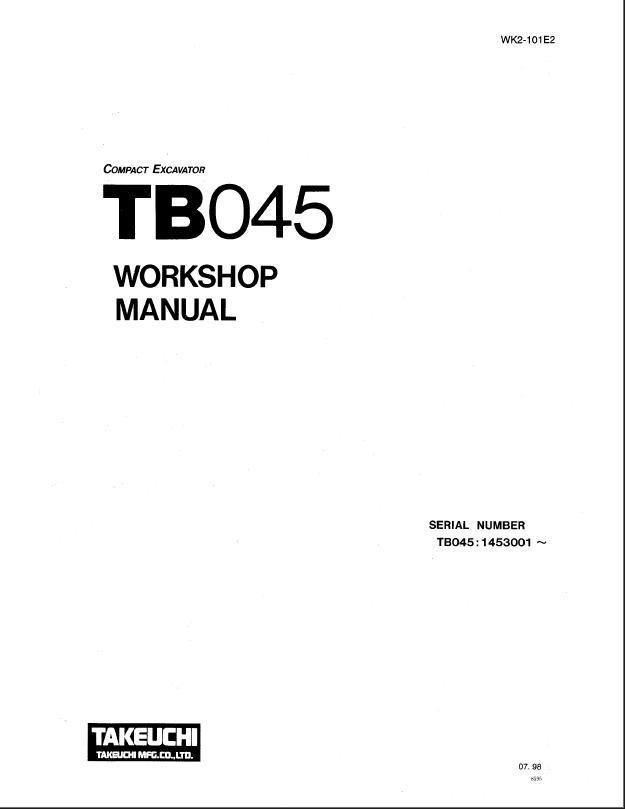 Takeuchi TB045 Compact Excavator Workshop Manual (WK2-101E2)